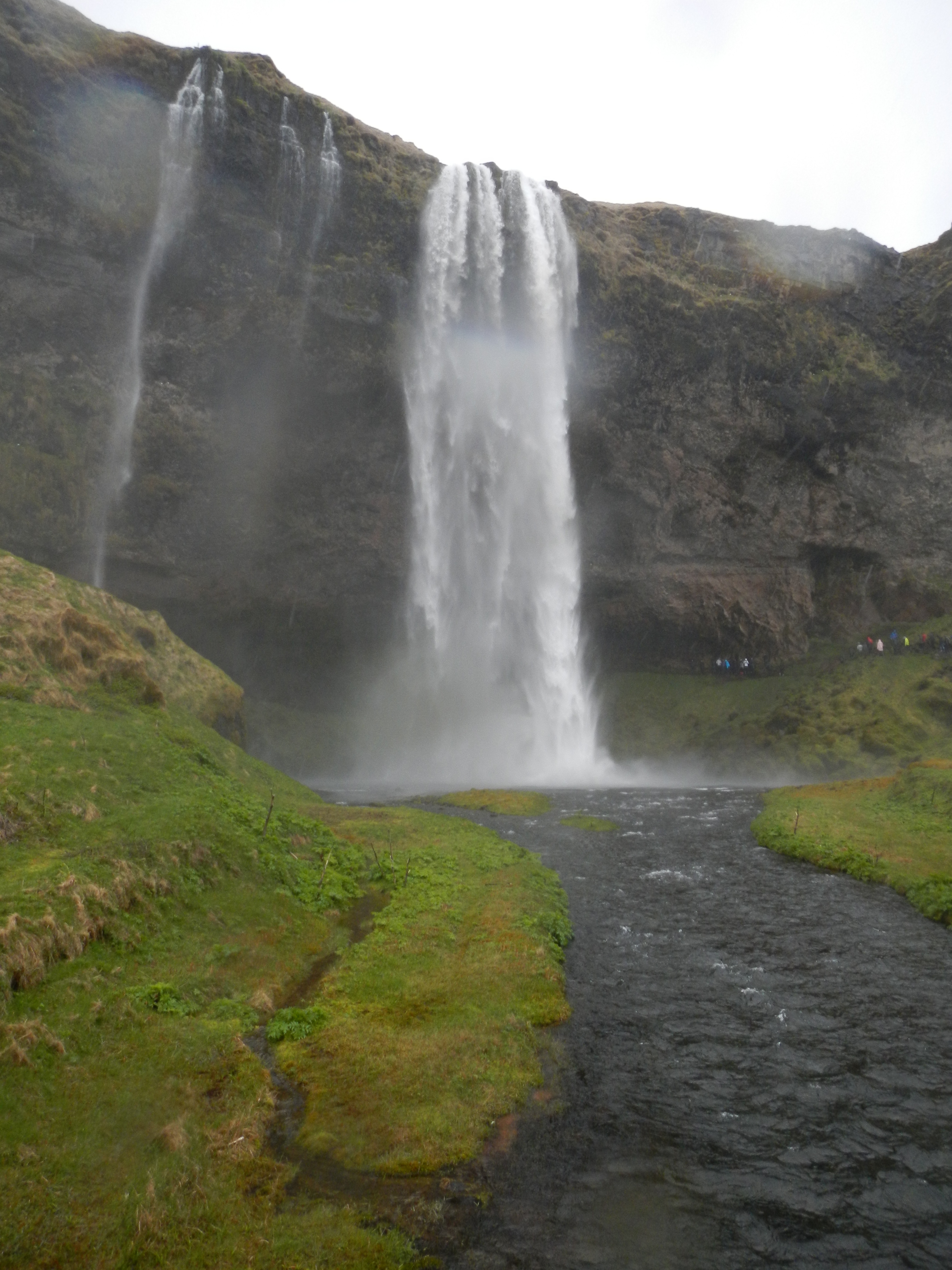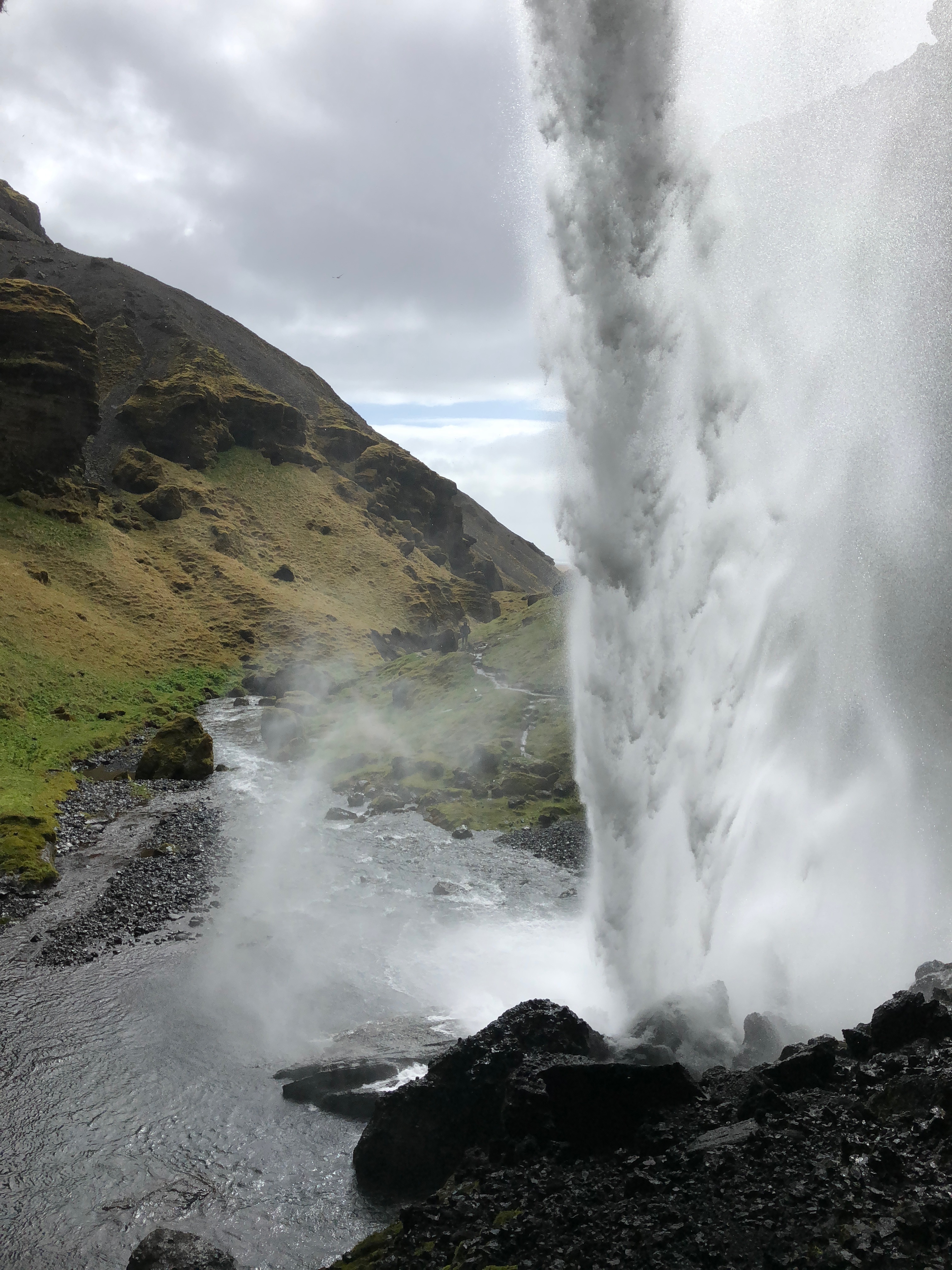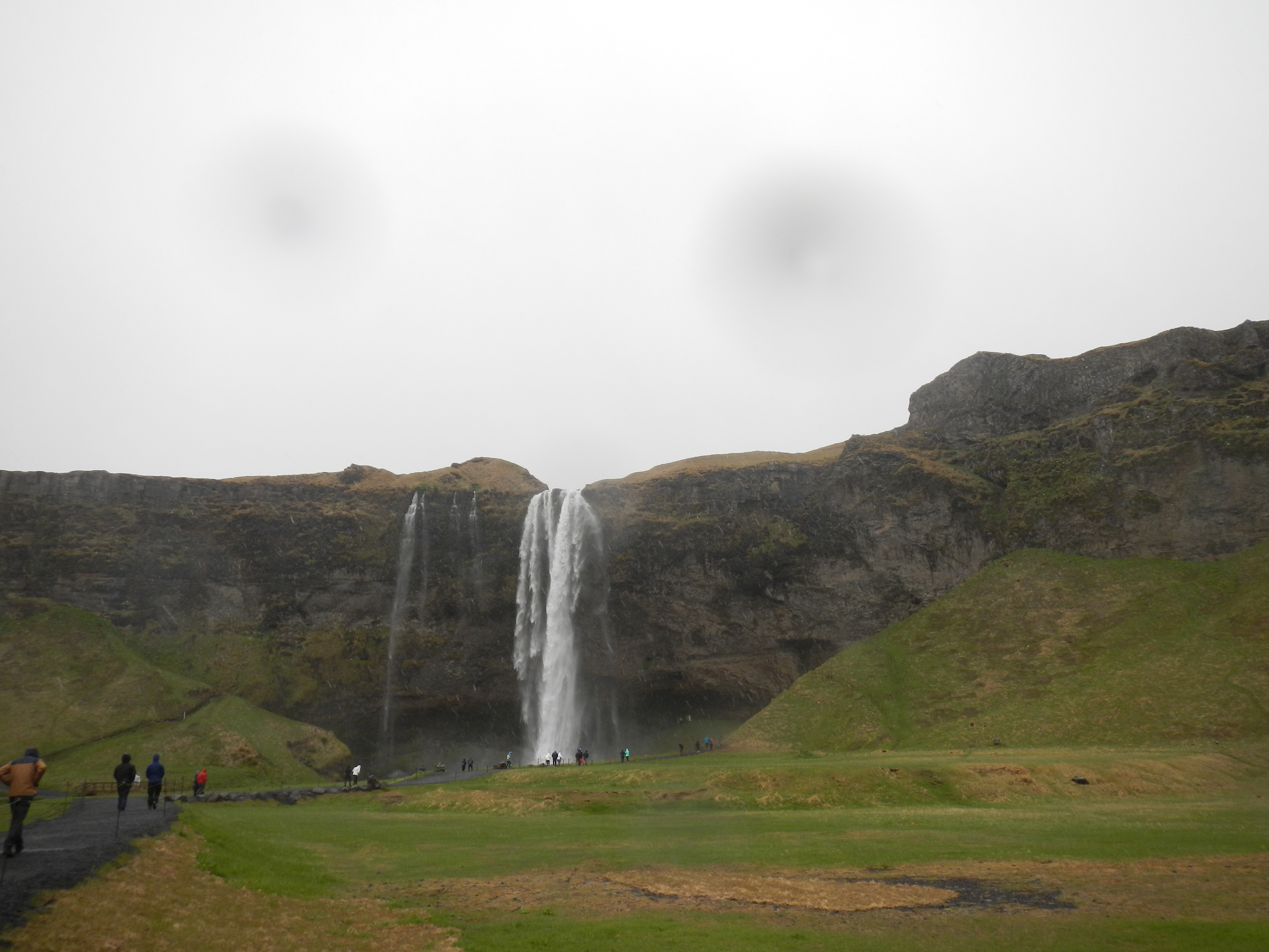 We had a wonderful breakfast and said goodbye to Hotel Laekur and headed south to the famous Seljalandsfoss. It was raining and windy when we arrived but Jeff and I had our waterproof clothes on and were ready to hike. Seljalandsfoss drops 200 feet over the cliffs of the former coastline. As impressive as the waterfall is one of the greatest things about it is that you can actually walk behind it. We sadly did not get one of the famous rainbow pictures with this waterfall but it was wonderful none the less. All of our pictures are tainted from water droplets on the camera lens but that reminds us of the conditions we hiked in. We returned to the car to find a sticker on the windshield that we had not paid for parking. We honestly did not see the pay booth when we arrived but they nicely let us pay without a fine and we went on our way.