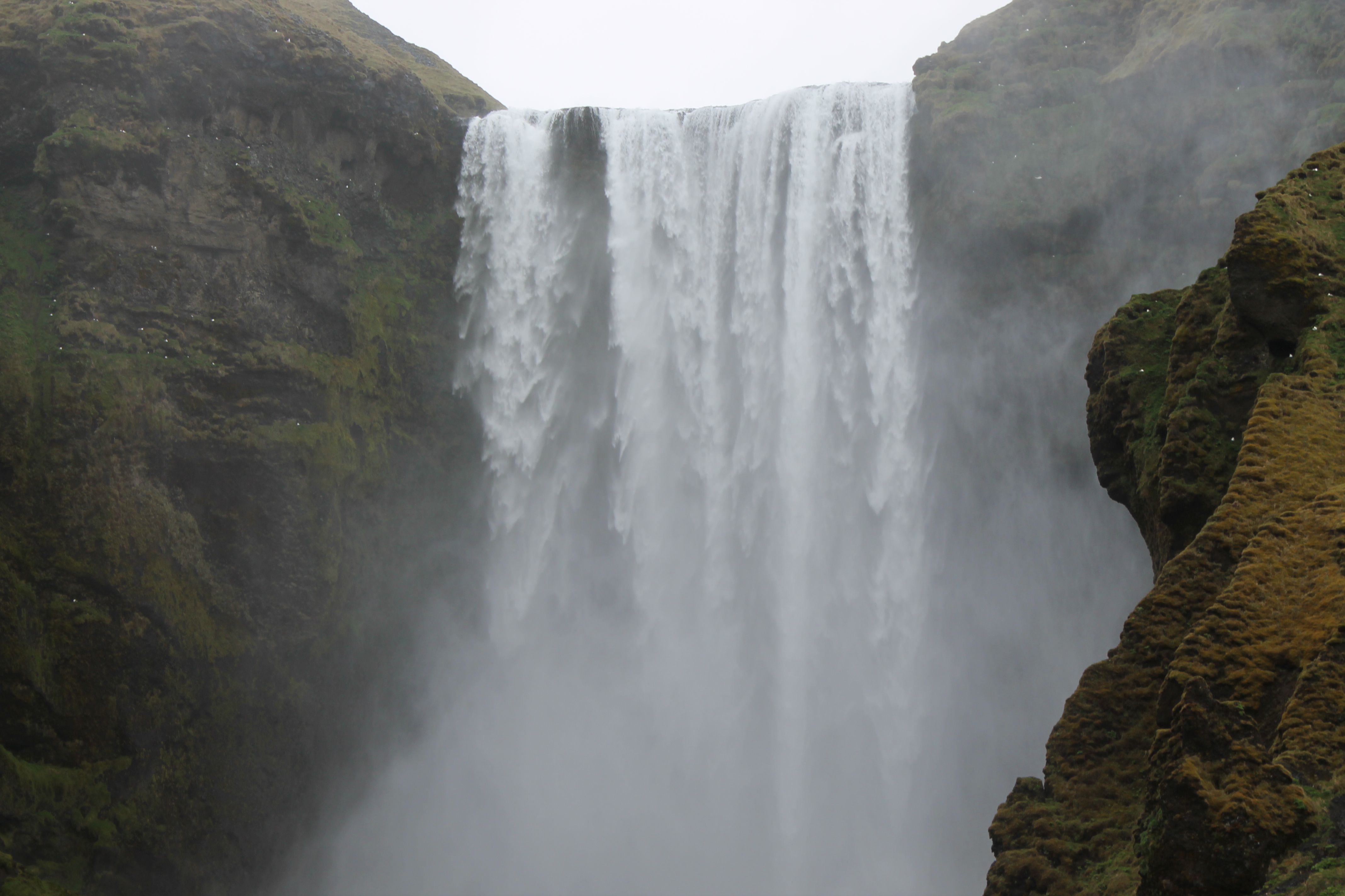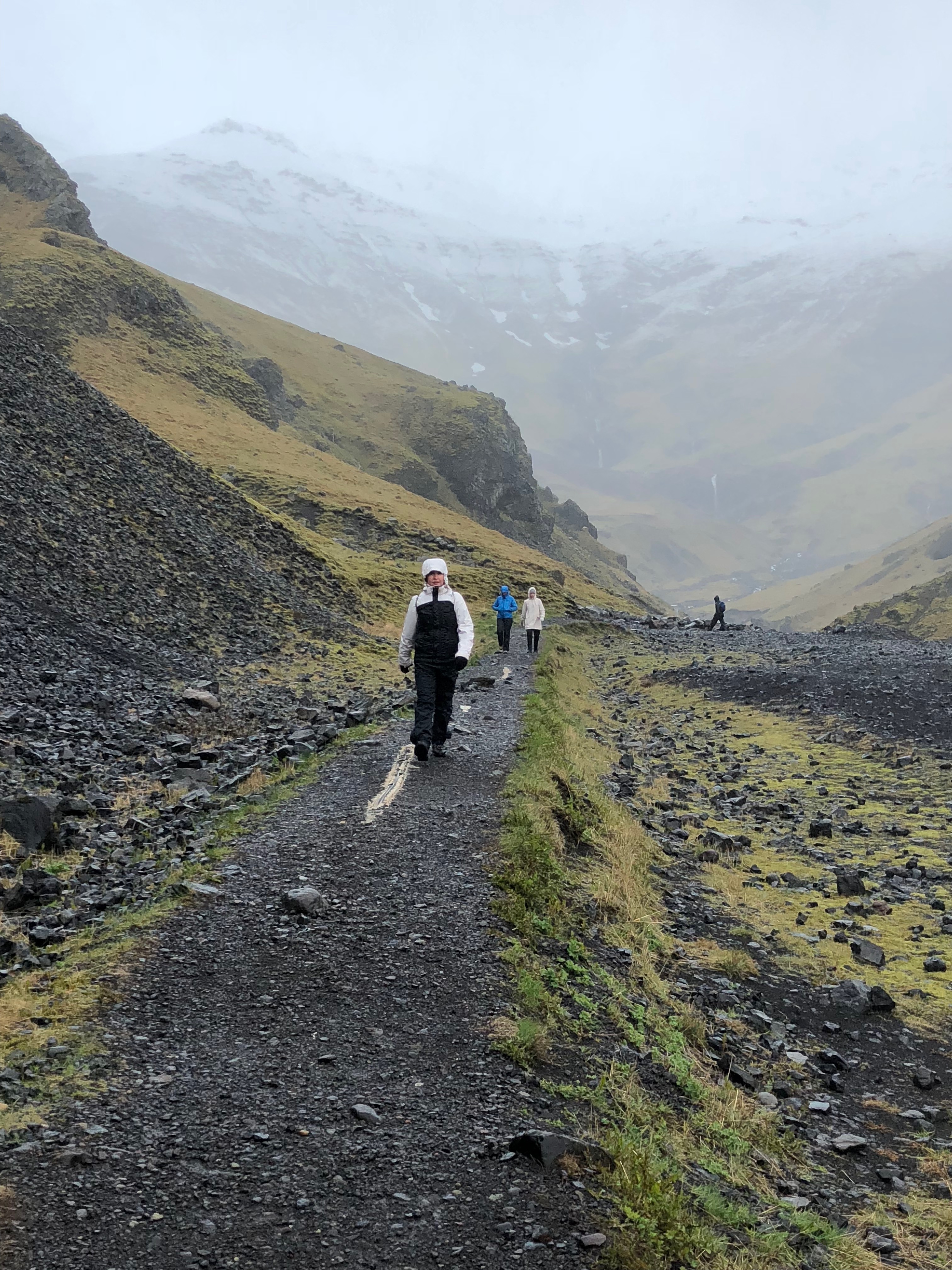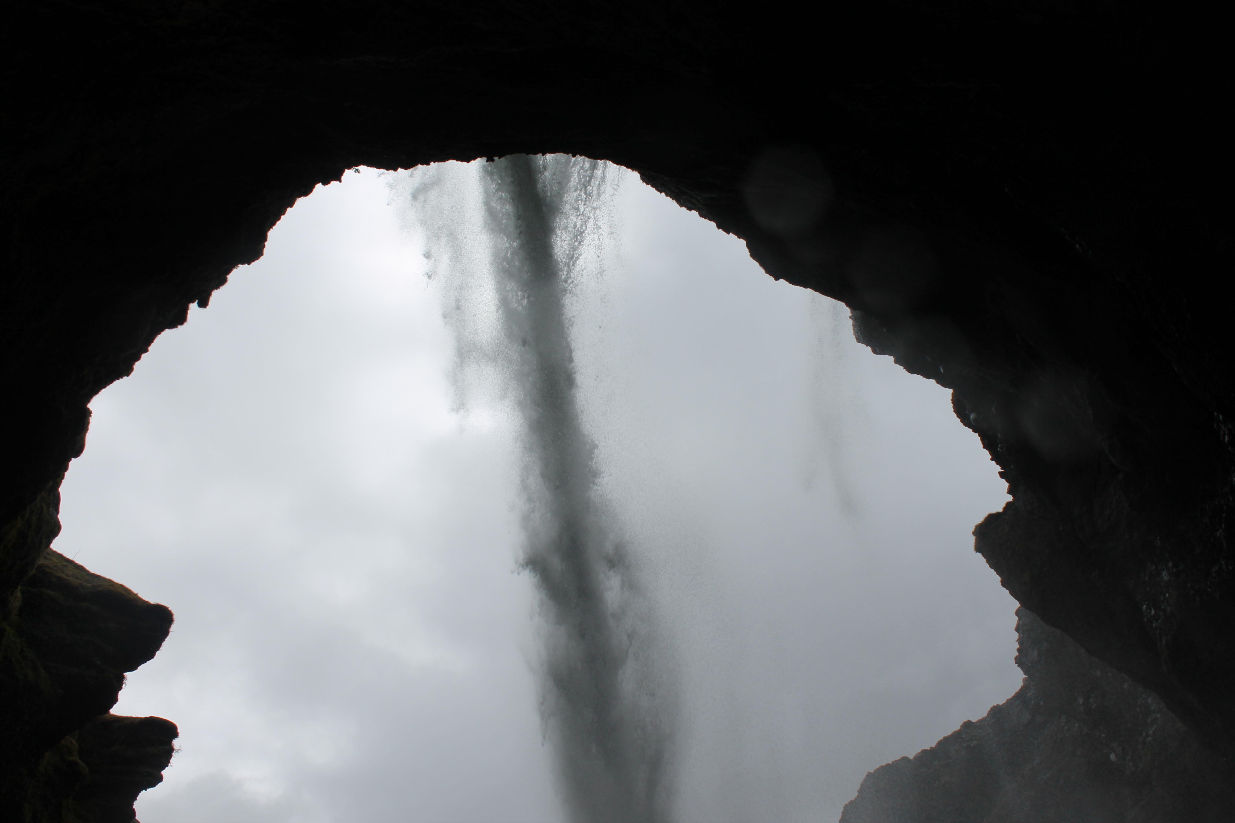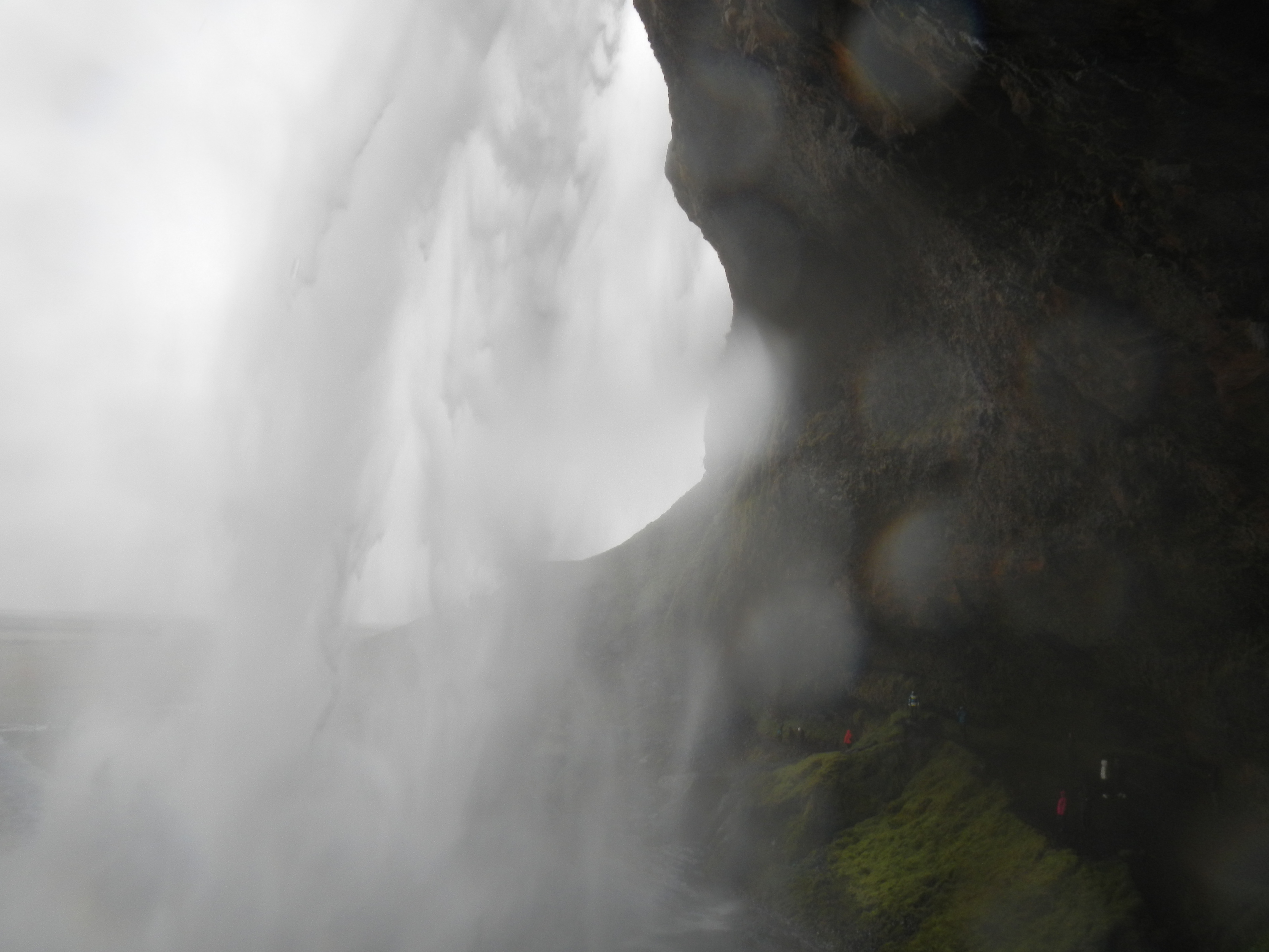 We had a wonderful breakfast and said goodbye to Hotel Laekur and headed south to the famous Seljalandsfoss. It was raining and windy when we arrived but Jeff and I had our waterproof clothes on and were ready to hike. Seljalandsfoss drops 200 feet over the cliffs of the former coastline. As impressive as the waterfall is one of the greatest things about it is that you can actually walk behind it. We sadly did not get one of the famous rainbow pictures with this waterfall but it was wonderful none the less. All of our pictures are tainted from water droplets on the camera lens but that reminds us of the conditions we hiked in. We returned to the car to find a sticker on the windshield that we had not paid for parking. We honestly did not see the pay booth when we arrived but they nicely let us pay without a fine and we went on our way.