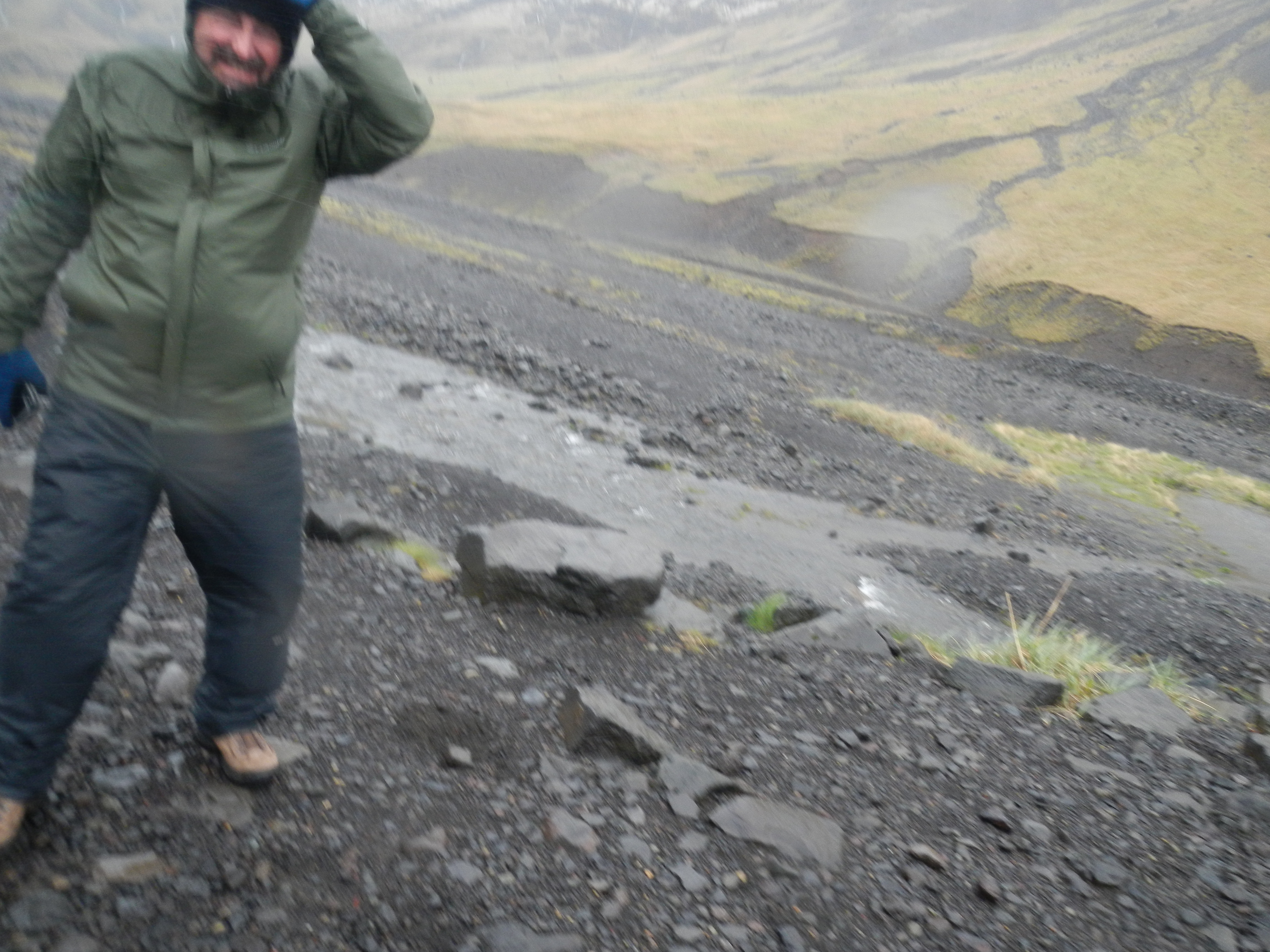 We were off again to Dyrhólaey. Fortunately I saw this rock outcropping in the distance on our way to the plane crash site. When we got out of the car here I really was afraid we would lose a car door. We started to make our way around to the overlook on the cliff. Then the wind decided to get really crazy. Then the hail started. Another couple ducked into the slight protection of a shelter with us. Jeff decided to try to get a picture for us. I just kept praying “don’t blow away, don’t blow away.” The couple with me thought they would try as they watched him. They quickly ducked back next to the structure with me.