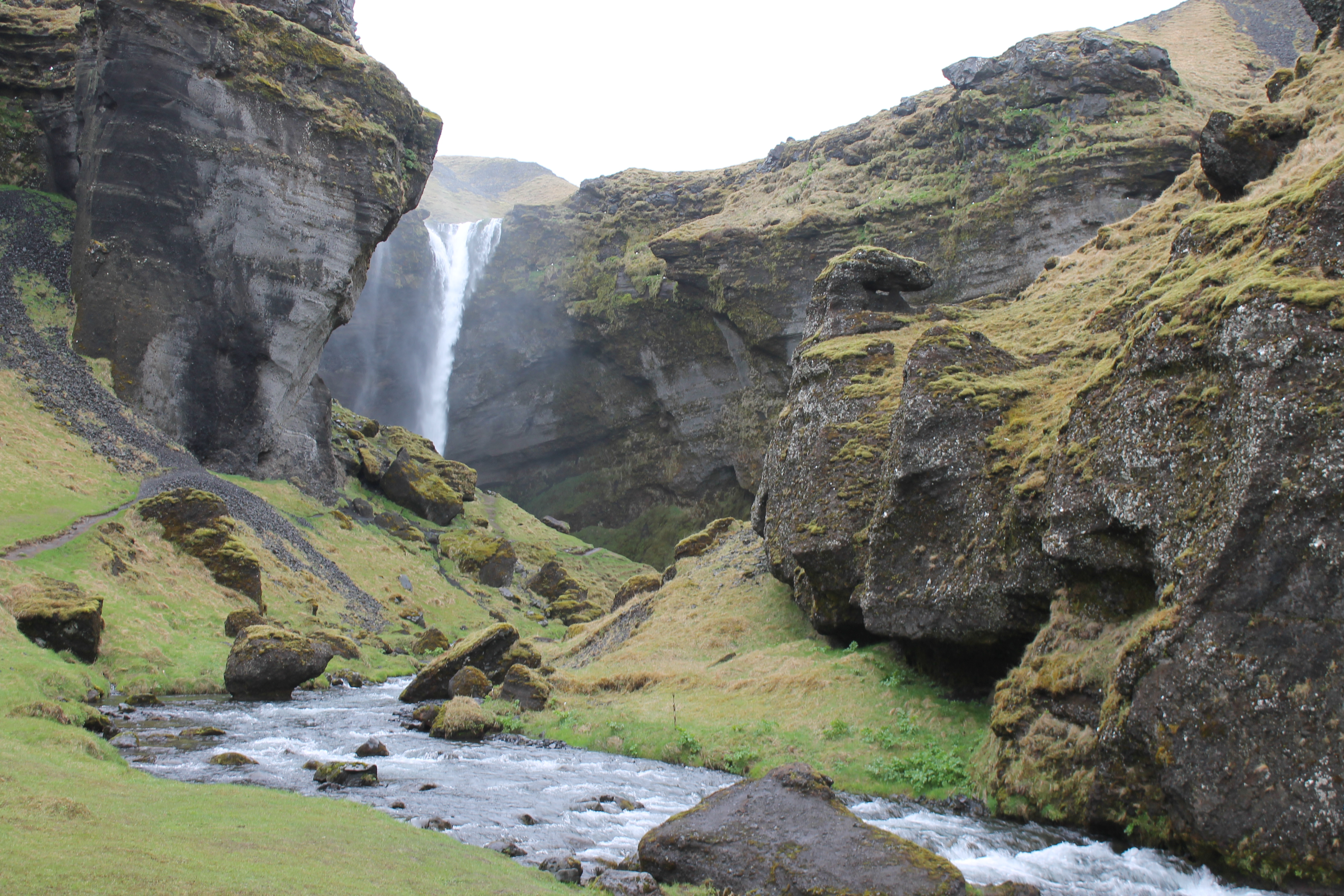 Just down the road and behind a museum is a little used trail to another unadvertised waterfall. Kvernufoss is hidden in a gorge at the other end of Skogar. We parked behind the Skogasafn museum and made our way on the ladder over the fence. After about a 15 minute hike we were rewarded with a view of the waterfall.